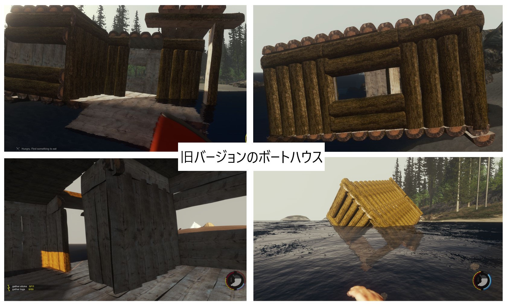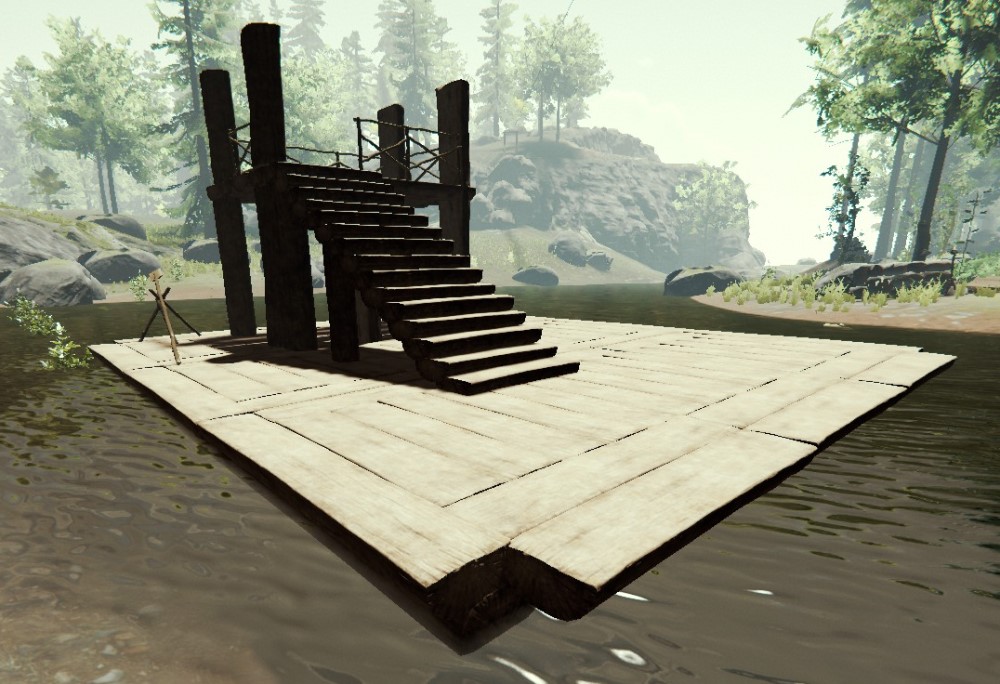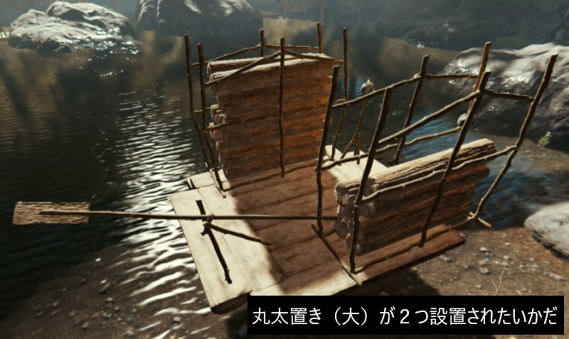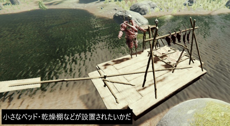 いかだ同様、小さなベッドや乾燥棚などを設置すると、簡易の水上移動拠点にもなり、丸太置きなどを設置すると、水上への建築にも使える。