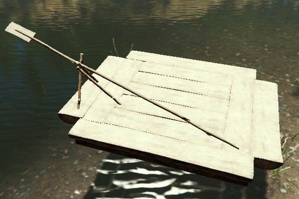小さなイカダ。オールに向かってEボタンで操舵モードに切り替えられる。左クリックで進み、右クリックで戻る。