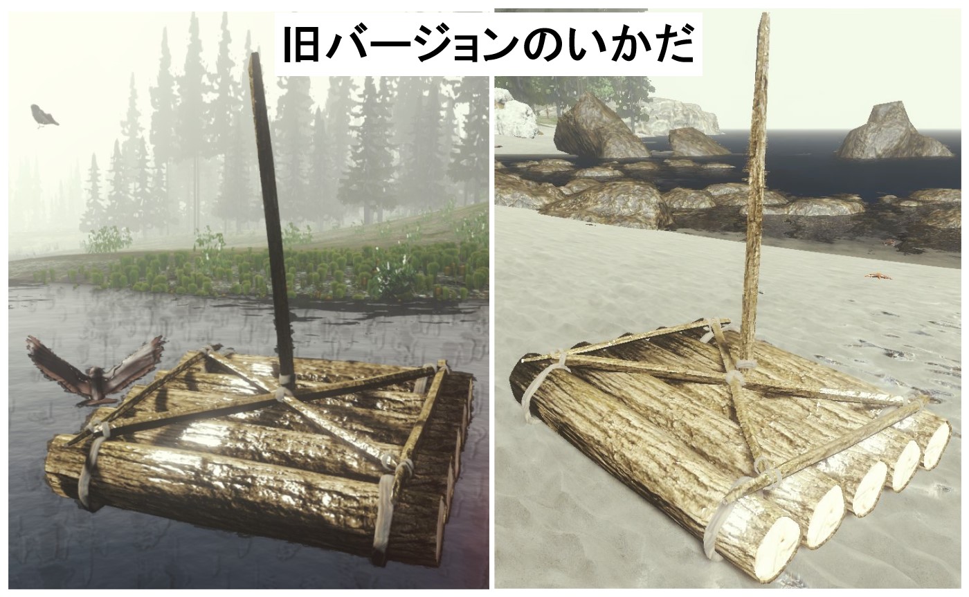 いかだ類の上に設置可能なのは、雨水収集具、乾燥棚、皮かけと木ぞりを除く保管庫カテゴリ、棒の印、小さなベッド、頭蓋骨の炉など。