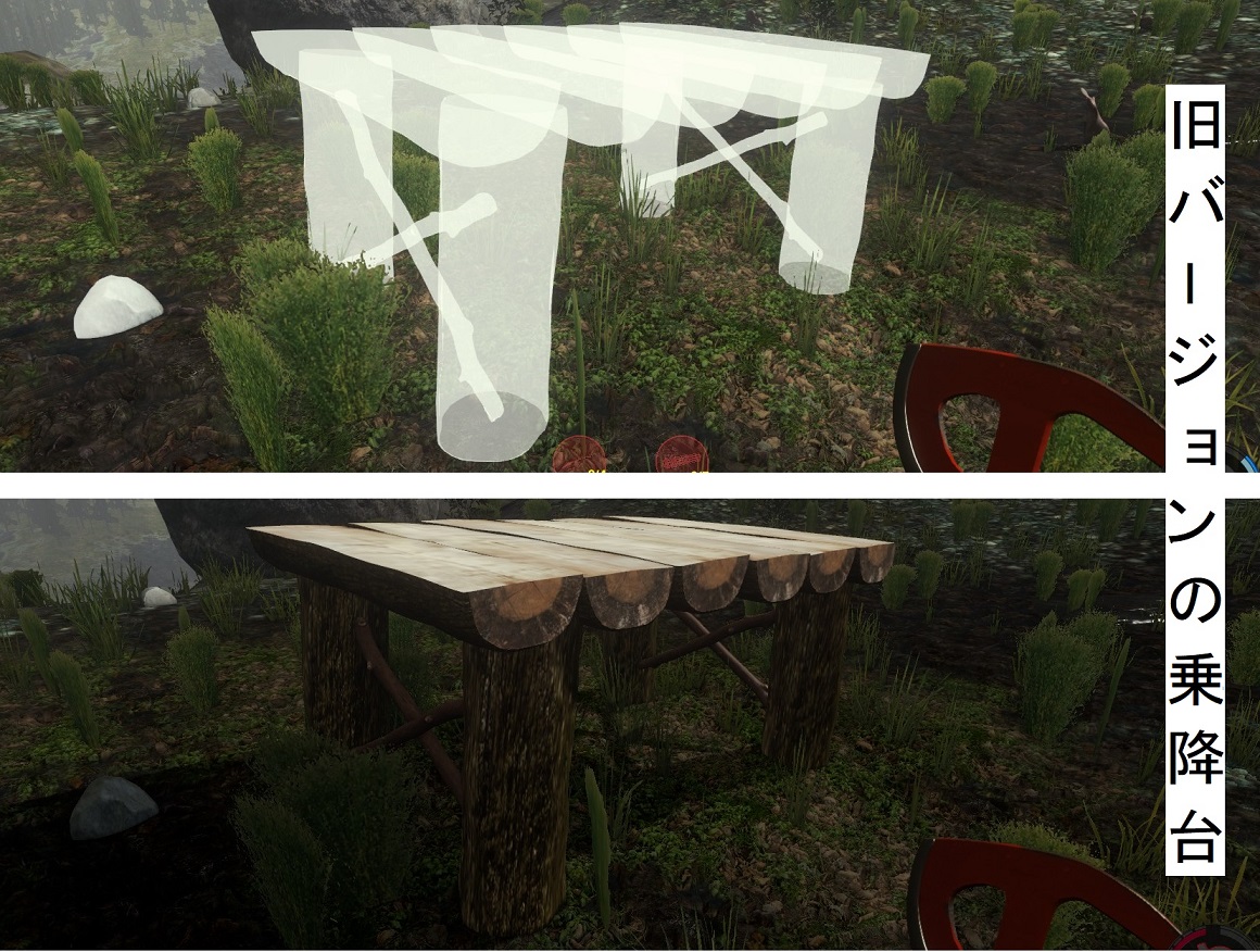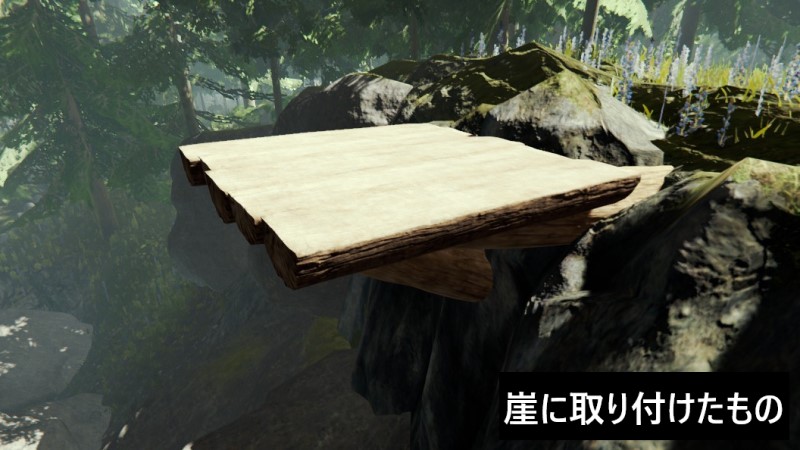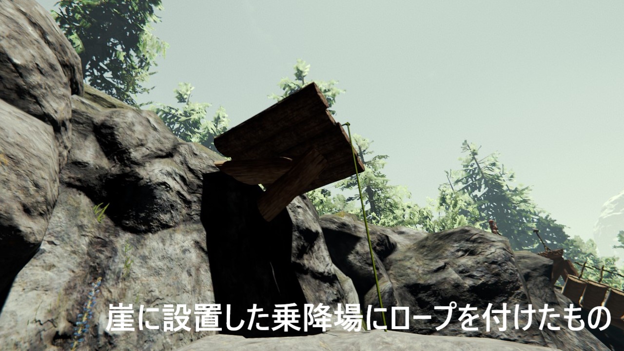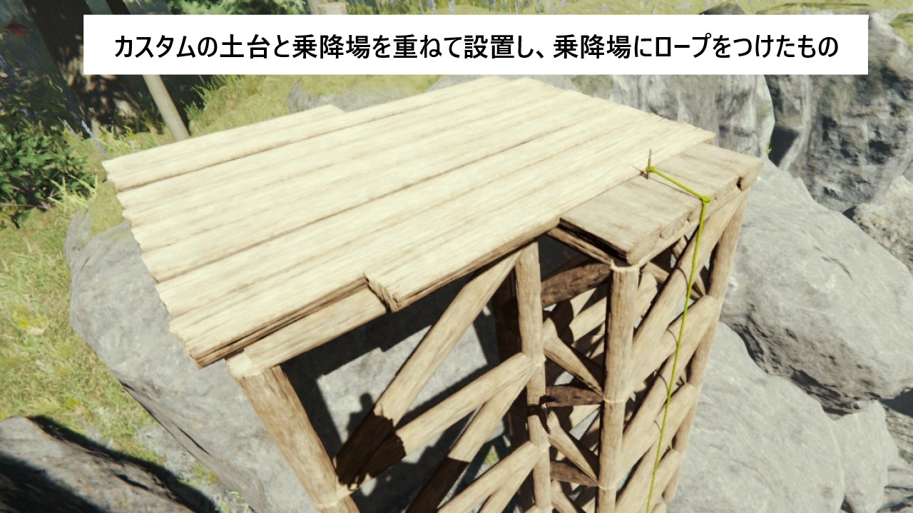 なお、この登山用ロープはカスタムの床やカスタム土台には取り付けられないが、普通の階段や乗降場などと組み合わせることで利用はできる。通常は重ねられない建築物も、両者の完成前だと重ねて設置することも可能なため、それを利用するとまるでカスタムの土台にロープを設置してるかのようにも出来る。