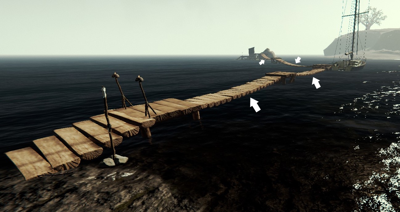 取付可能な箇所には、サバイバルブックからこの木造の橋を選択すると、錨(いかり)マークが表示される。